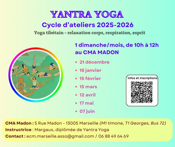 Cours mensuel de Yantra Yoga📌 Dimanche 21 décembre 25 À Marseille, avec l'enseignante Margaux Tsin. 📩Contact : ecm.marseille.asso@gmail.com |